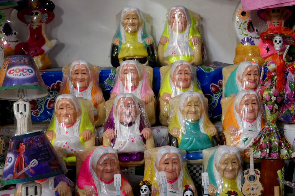 One street was particularly ornate – with a large-screen TV and sound system. This was a house and shop celebrating Mama Coco, the human model for Disney’s Coco, who died this year at age 103. A lovely alter and plenty of tacky souvenirs for purchase.