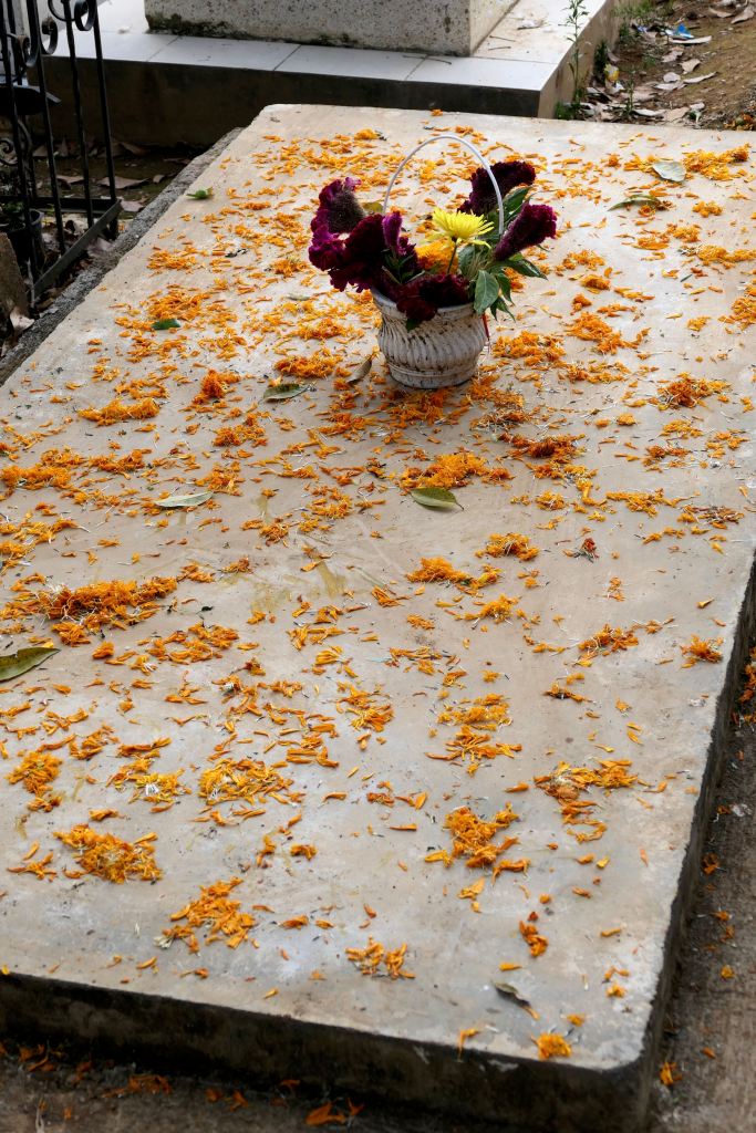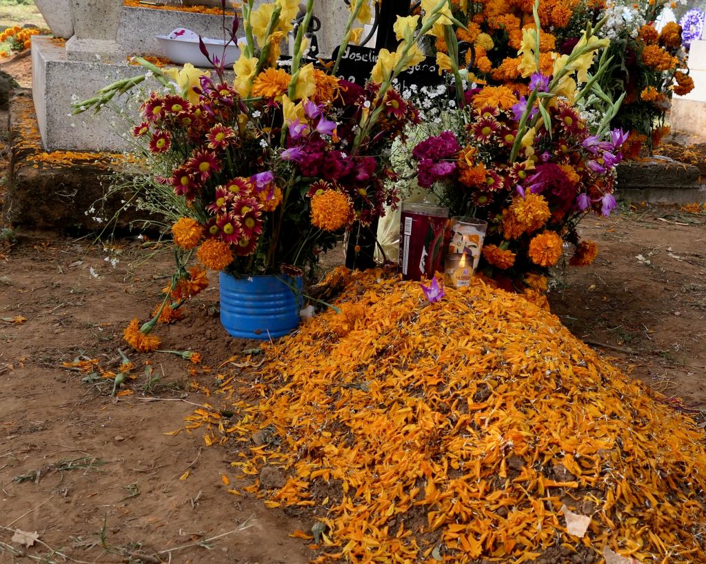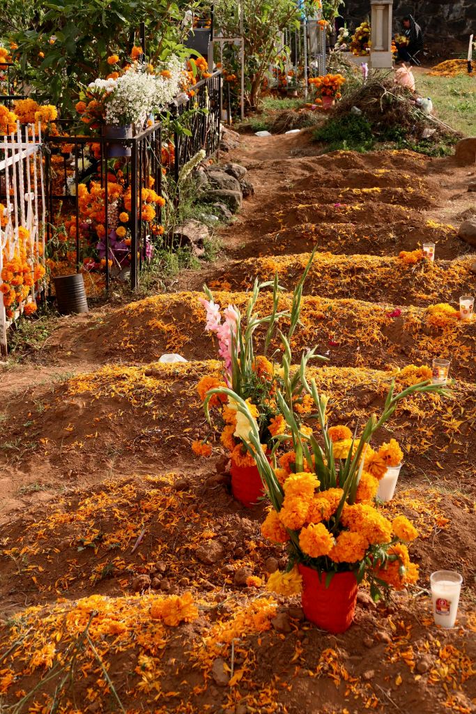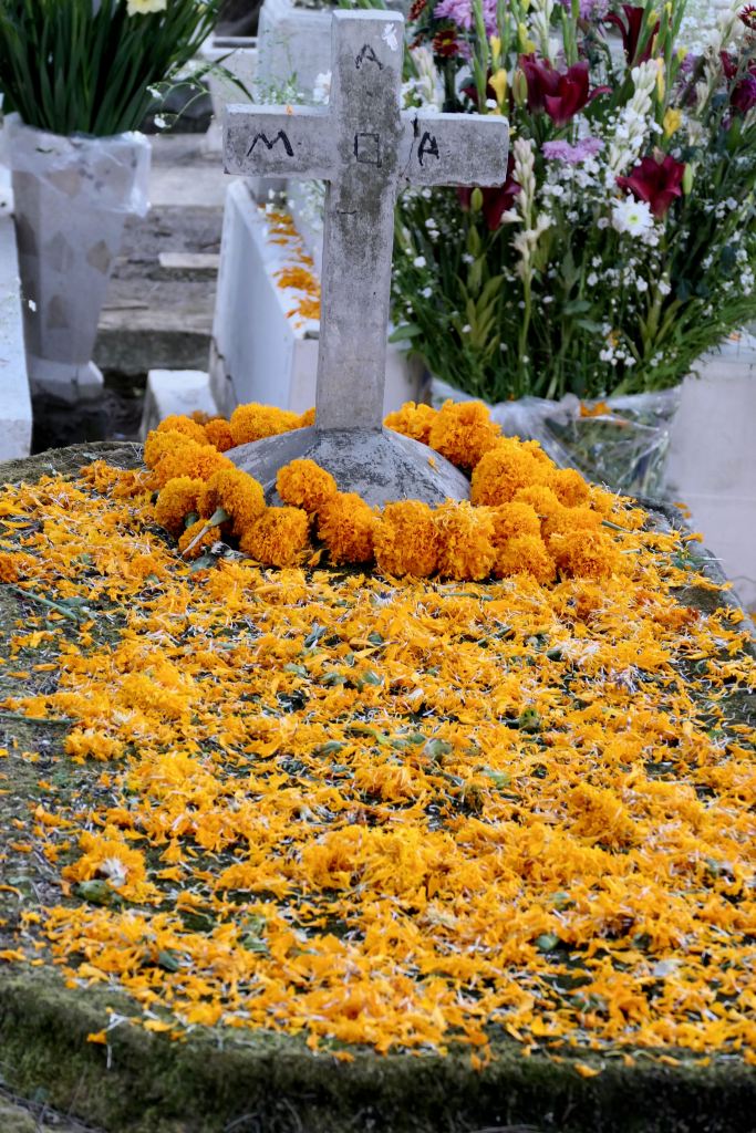 Most graves were merely mounds, and numerous tiny ones, among the few tombs and structures — unmarked but for petals of marigolds and perhaps a candle or favorite candy or drink. One wide sidewalk was lined with imprints of crosses scattered with marigold petals.