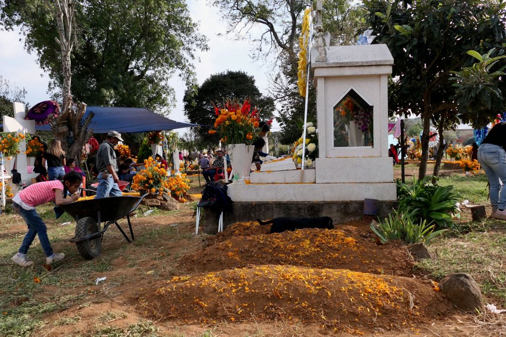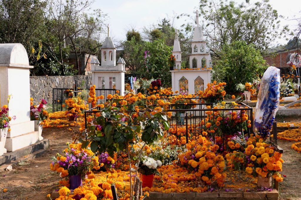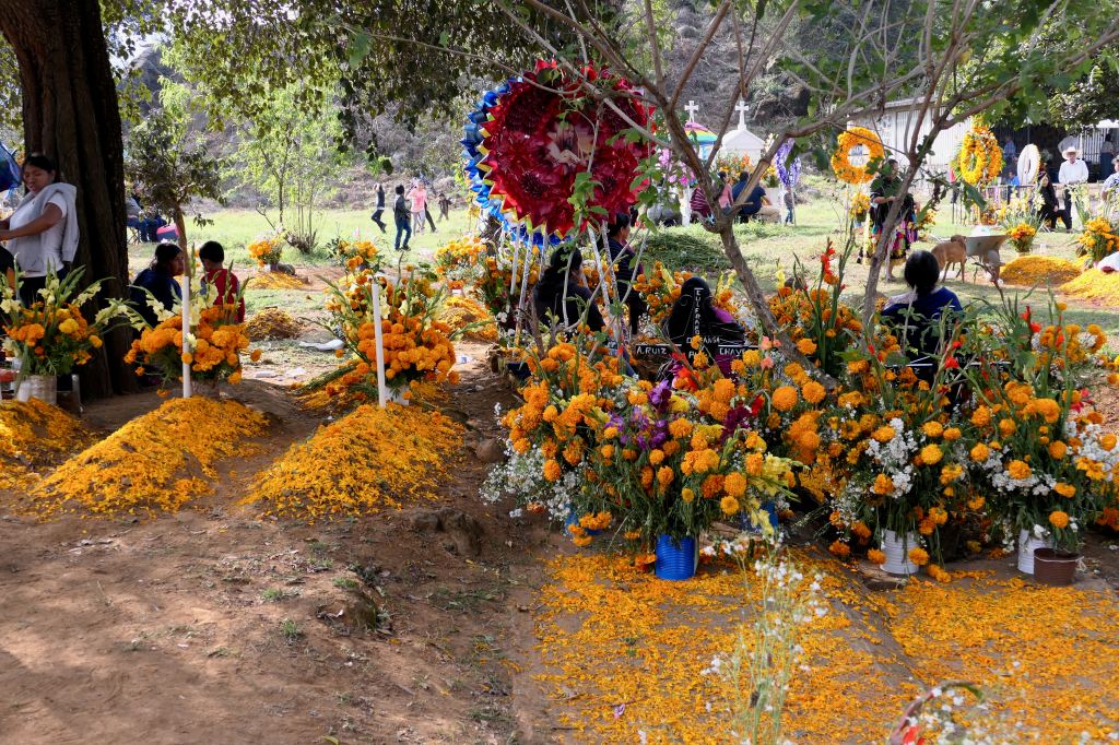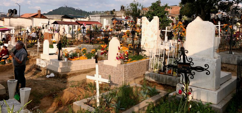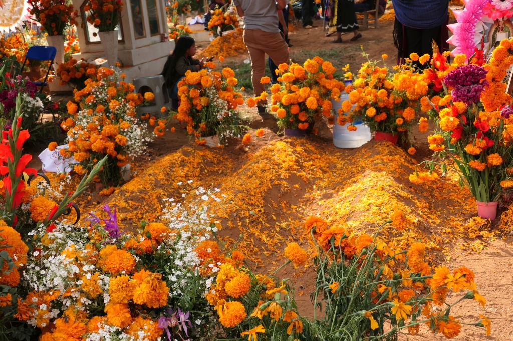 Most graves were merely mounds, and numerous tiny ones, among the few tombs and structures — unmarked but for petals of marigolds and perhaps a candle or favorite candy or drink. One wide sidewalk was lined with imprints of crosses scattered with marigold petals.