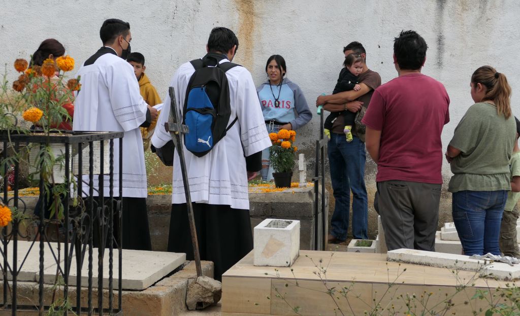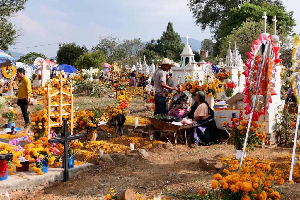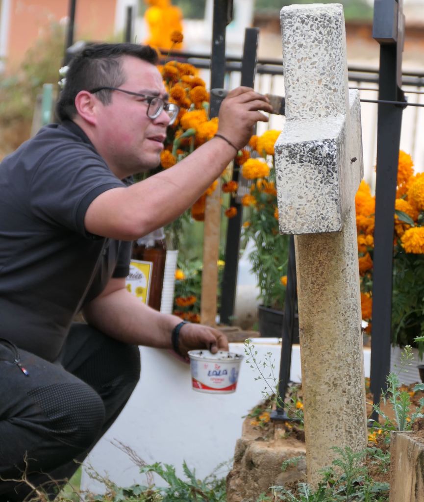 All ages gathered to sweep, plant, place bouquets, repaint a marker – and to play music and sing, eat Pan de Muertos (special sweet bread for the occasion) and the favorite foods of their loved ones.