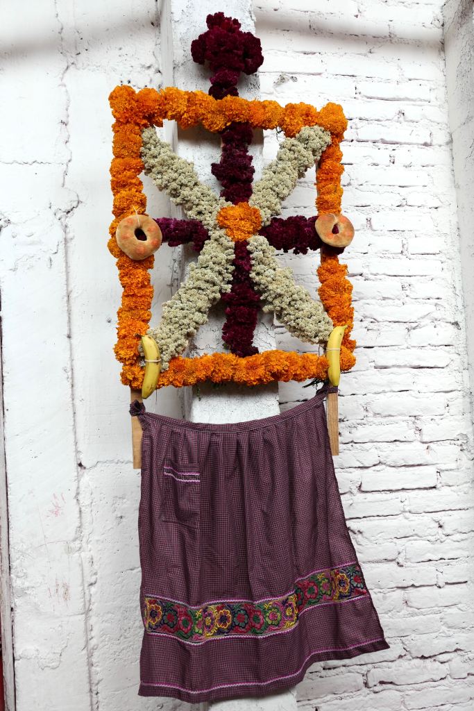 Continuing our meander, we peeked into an open door decked with flowers. A woman gestured us inside the courtyard. Our jaws dropped at the opulence and art before us: A house built entirely of flowers and pottery; mounds of bananas, oranges, apples; candles, candles, candles; a cross, of course, and pictures of the loved one.