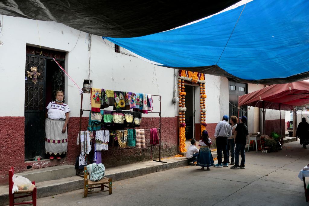 A garland of marigolds in the distance signaled the zocolo (town square). As zocolos go, it was somewhat stark, with only a few stands of vendors.