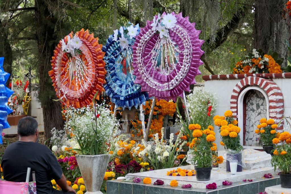 Tombstones, markers, and elaborate structures covered in flowers, ribbons, enormous bouquets, gigantic photos of loved ones, baskets of breads and tortillas, corn, beer, candy, fruits….