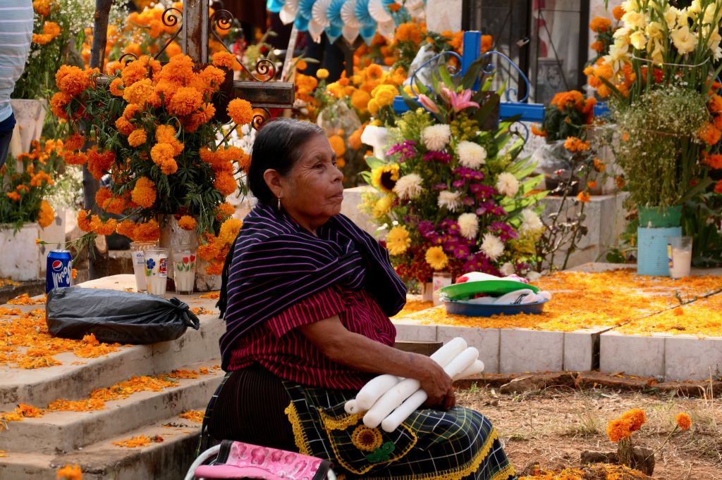 Tzitzuntzan’s cemetery spans both sides of the highway, although we took in only one. Marigolds, candles, baskets of food, even a campfire – and people! — multitudes of people, both participants and tourists – as far as the eye could see.