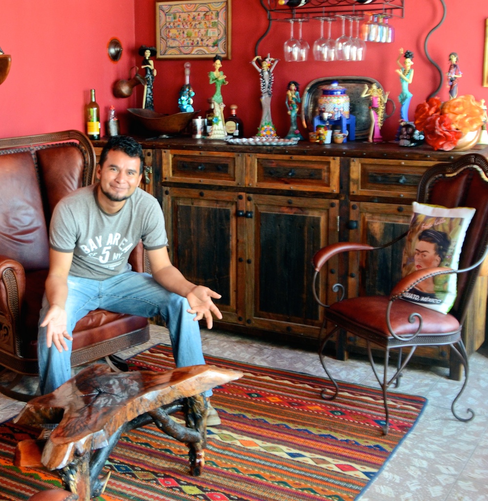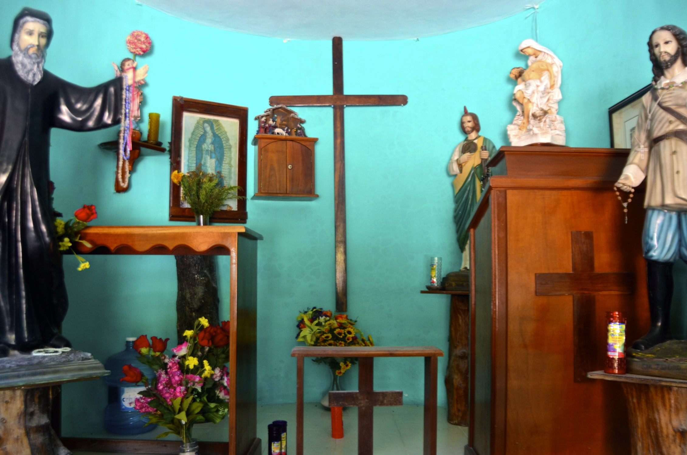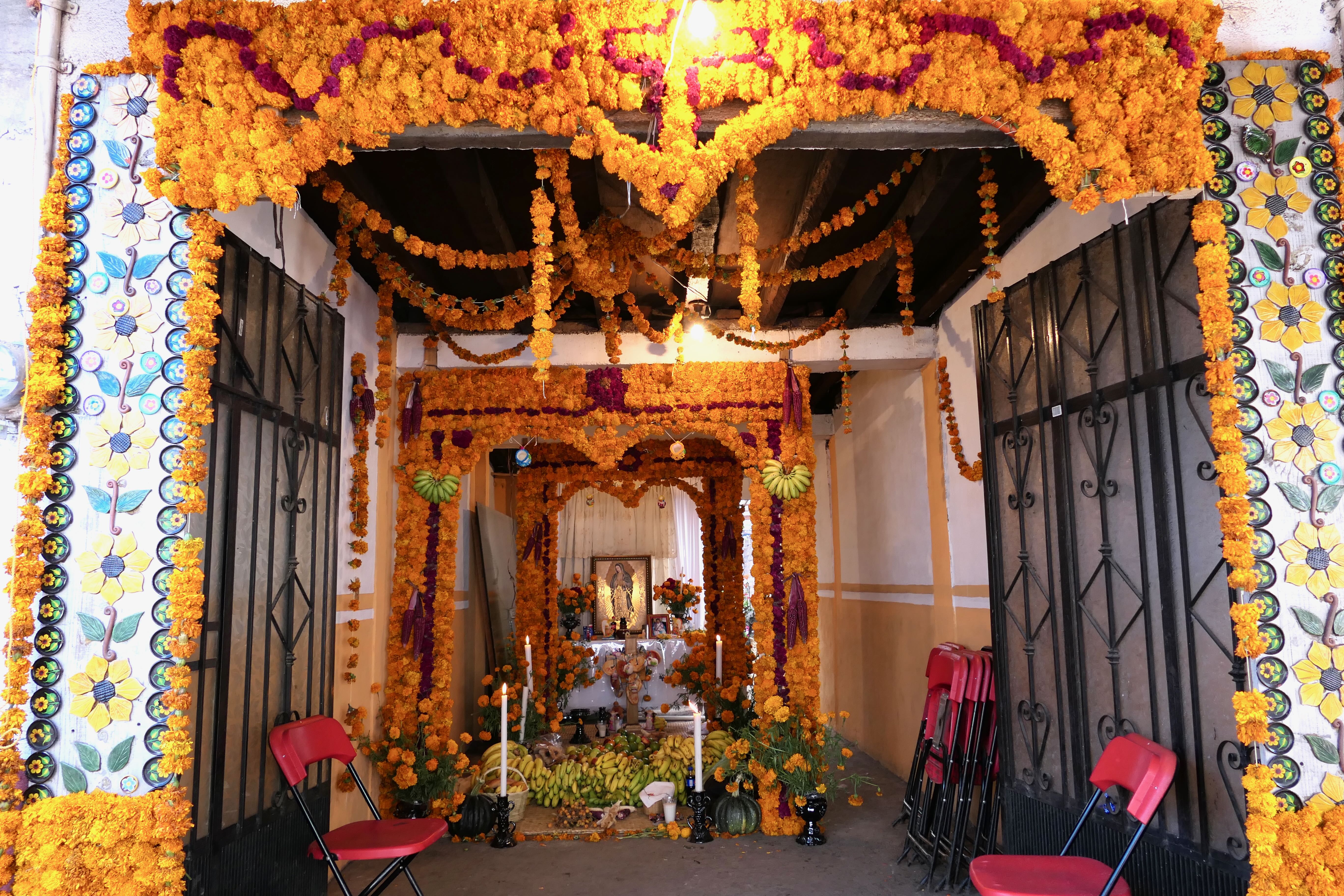 Continuing our meander, we peeked into an open door decked with flowers. A woman gestured us inside the courtyard. Our jaws dropped at the opulence and art before us: A house built entirely of flowers and pottery; mounds of bananas, oranges, apples; candles, candles, candles; a cross, of course, and pictures of the loved one.
